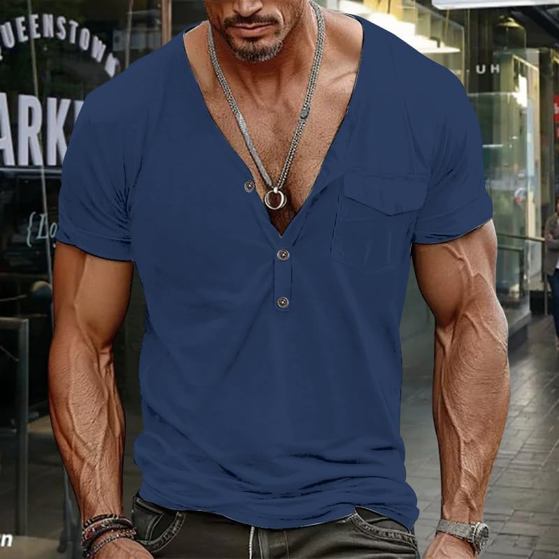 HOTYD Men’s Casual Short Sleeve Henley Shirt Plus Size Solid Color V Neck Tee Summer Basic Soft Tops With Pockets